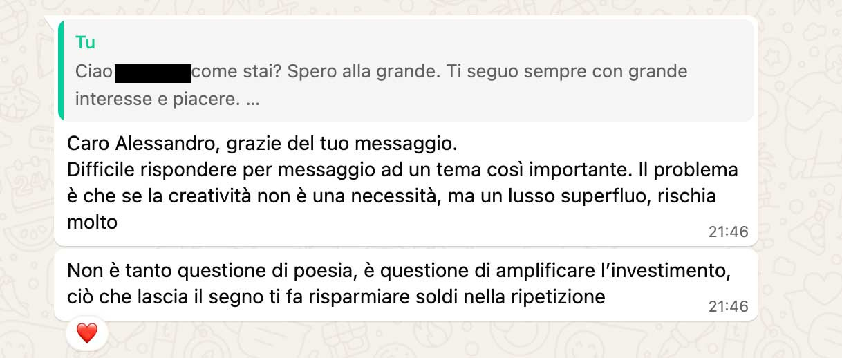 Quando ho i dubbi, quando sento di aver tradito la mia creatività, quando la paura mi sussurra di "spiegare meglio", c'è una persona che vado sempre a cercare. Un grande creativo italiano che per me è la luce artistica e creativa. Gli scrivo, e lui mi risponde sempre con la saggezza di chi ha fatto della purezza creativa una religione.