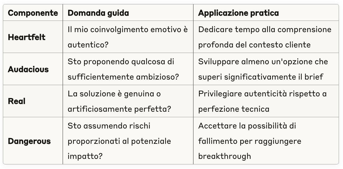 L'integrazione del framework di Farber nel processo creativo richiede un approccio sistematico che trasformi principi teorici in metodologia operativa. L'acronimo HARD (Heartfelt, Audacious, Real, Dangerous) fornisce una struttura per valutare e guidare decisioni creative che generino impatto duraturo.